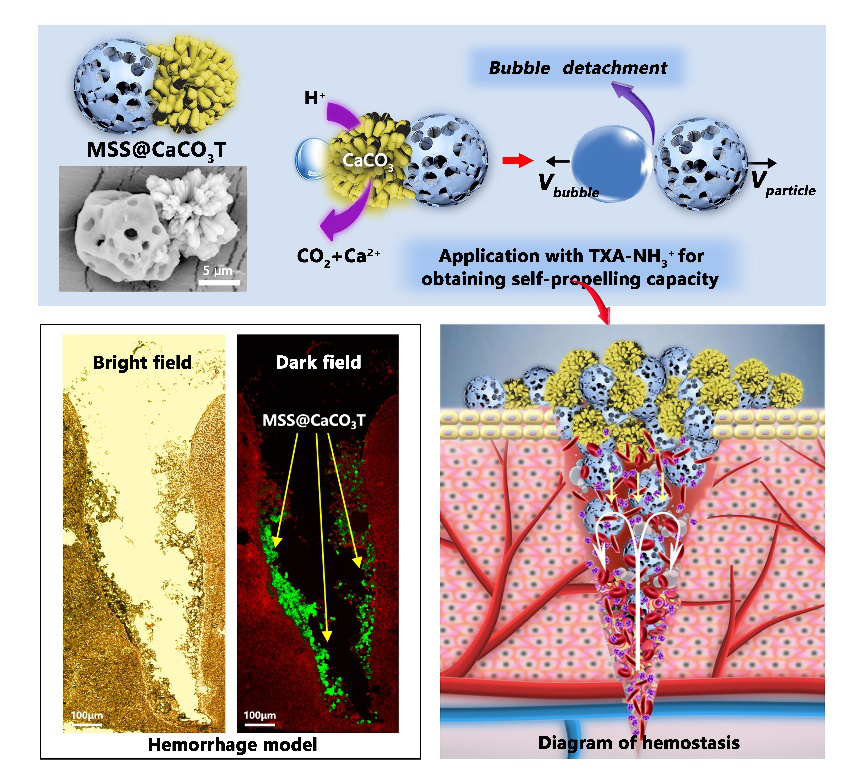 在战场创伤和意外事故中,贯穿型及窄而深的伤口出血,由于出血量大且出血点隐蔽,若不能及时有效的止血,短时间即可能导致出血过多而死亡。传统的止血材料往往只能施加于伤口的表面,难以及时深入伤口内部的出血点,因而难以快速有效控制该类型大出血。该研究通过对止血粉的表面赋能使止血颗粒在施加于伤口时能高精度“自推进”至深型、贯穿型无规型等类型的大出血伤口的隐蔽出血点,并发挥其负载的止血因子的作用,实现伤口靶向止血研究成果革新了传统止血材料仅仅依靠创口表面封堵的常规方式,取而代之以能实现将止血材料快速递送到伤口内部出血点进行精准止血的止血新途径。它在战场急救和事故现场急救上具有重大的应用前景,而且为止血材料领域中设计定向功能化结构、构建载送药物驱动力模型及研发快速有效止血材料提供了新的思路。