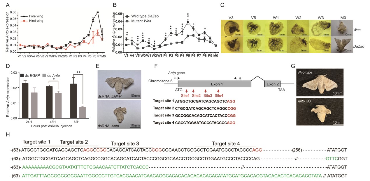 课题组研究表明,在家蚕、果蝇和赤拟谷盗中敲低或敲除Antp基因后会导致成虫翅变小,且呈卷曲皱缩状。进一步研究揭示,Antp通过直接调节翅原基中蜕皮激素合成基因Shade的表达,从而调控翅原基中蜕皮激素20-羟基蜕皮酮(20E)的含量,进而调节昆虫变态过程中翅的发育;同时,Antp也能直接通过与翅发育相关基因(如表皮蛋白基因)的顺势调控原件结合调控翅的发育。该研究不但提供了Hox基因Antp对昆虫翅发育不可或缺的新认识,而且深入解析了Antp基因调控昆虫翅发育的分子机理。