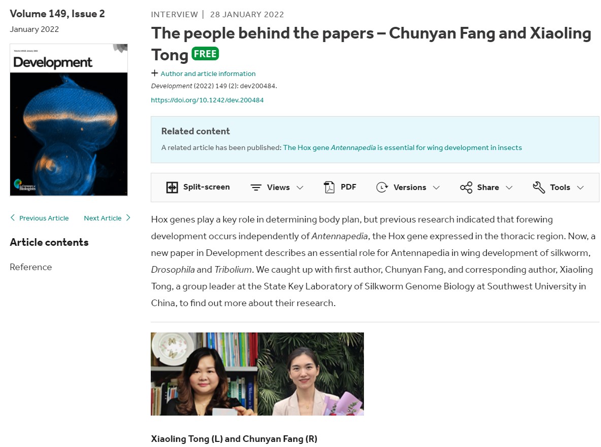该论文被Development杂志选为当期唯一的一篇“亮点文章”(Highlighted Article),并对研究人员进行了专访(The people behind the papers — Chunyan Fang and Xiaoling Tong),论文随即被Flybase收录。