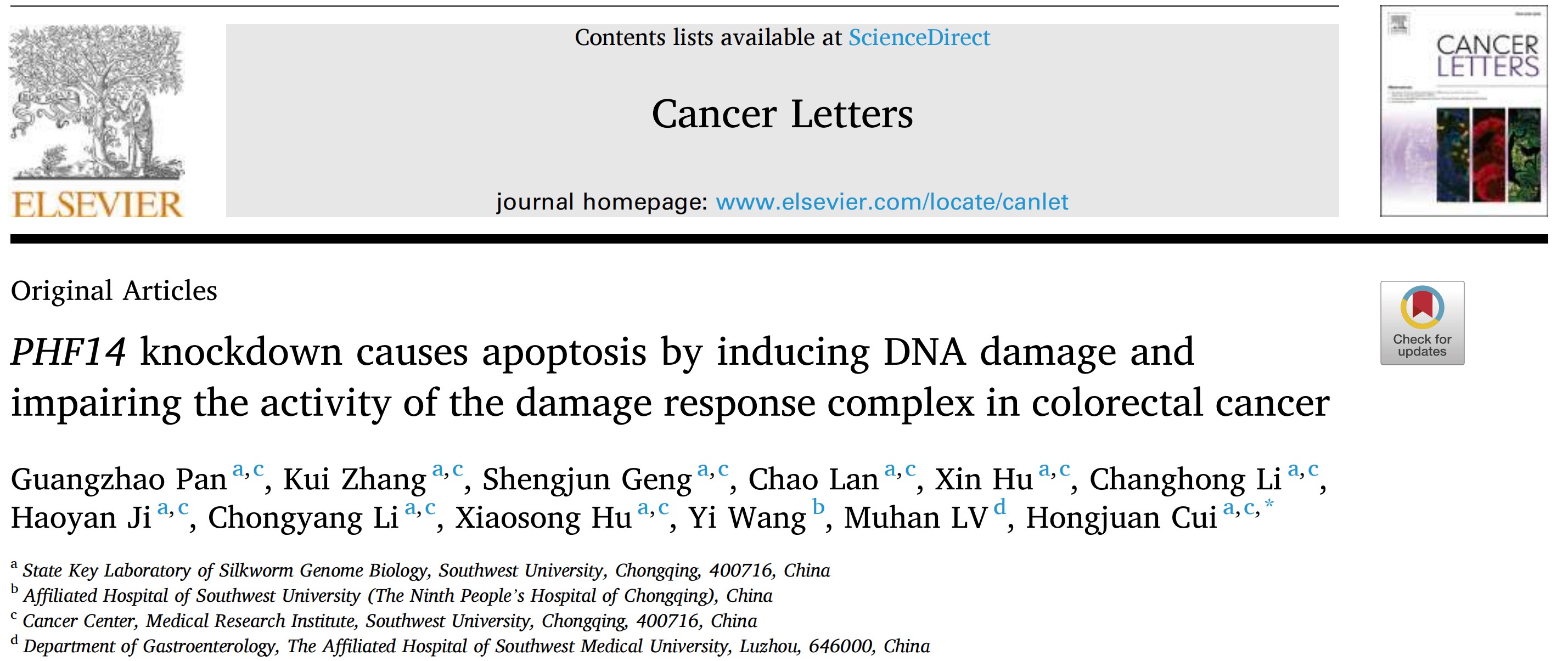 近日,PA视讯官网家蚕基因组生物学国家重点实验室崔红娟教授团队在国际肿瘤学TOP期刊Cancer Letters(医学类一区,IF2020=8.679)在线发表题为:“PHF14 knockdown causes apoptosis by inducing DNA damage and impairing the activity of the damage response complex in colorectal cancer”(在结直肠癌中下调PHF14的表达可通过诱发DNA损伤和损坏损伤响应复合物活性介导细胞凋亡)的研究论文。