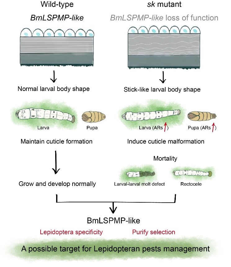 鳞翅目是昆虫纲中仅次于鞘翅目的第二大目,是农作物和森林的主要害虫。鳞翅目害虫的表皮在抵御杀虫剂和病原体方面起着非常重要的作用,同时在其整个生命周期中对构建和维持胞外结构和运动起着不可或缺的作用。鳞翅目昆虫特异的表皮蛋白可能是鳞翅目害虫防治的潜在靶点。利用鳞翅目昆虫的模式——家蚕作为研究对象,有助于加速推动鳞翅目害虫靶标的鉴定和分子机制的阐释。研究团队基于长期开展家蚕遗传资源保护和突变基因鉴定的坚实基础,先后解析了家蚕“石蚕”(Genetics, 2014)、“竹蚕”(Genetics, 2017; Pestic. Biochem. Phys., 2018)等体形突变型的控制基因和作用机理。