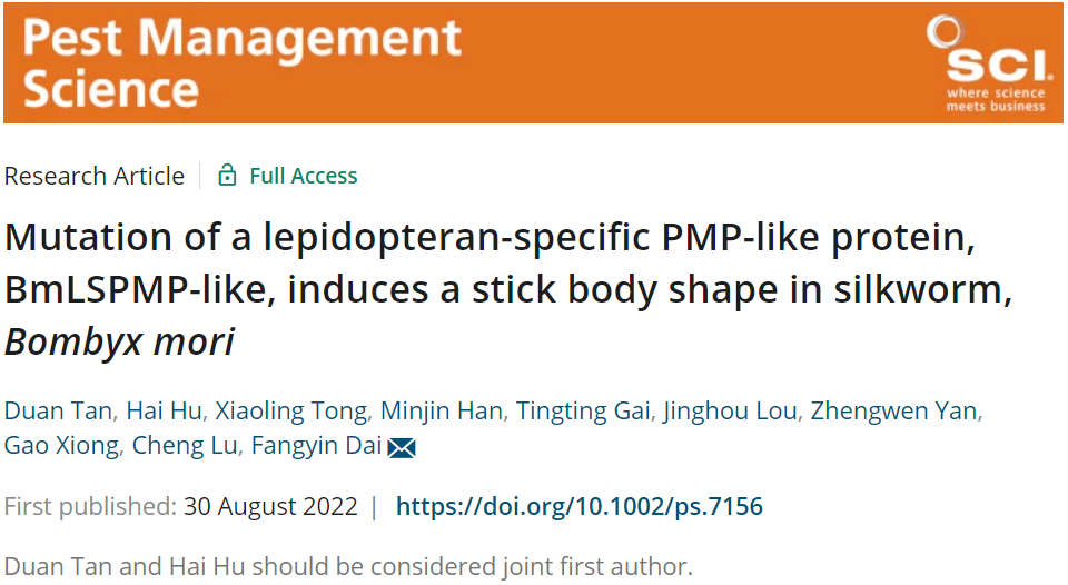 近期,中科院JCR分区农林科学类一区国际期刊Pest Management Science在线发表了家蚕国重室代方银教授团队研究论文“Mutation of a lepidopteran-specific PMP-like protein, BmLSPMP-like, induces a stick body shape in silkworm, Bombyx mori”。该研究鉴定了鳞翅目模式昆虫家蚕中“枝蚕”(stick)突变体的因果基因BmLSPMP-like,阐释了在幼虫表皮构建、体型维持及适应性中的作用,揭示其是鳞翅目害虫生态防控的潜在靶标。