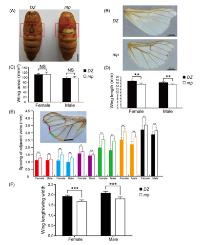 PA视讯官网家蚕基因库保存有一种小翅突变体(micropterous, mp)。与野生型对照相比,mp突变体蛹的翅不能覆盖到第三腹节,处于裸露状态;羽化以后,蛾的翅长显著短一些,翅的长宽比显著变小,而翅面积却未发生明显改变。