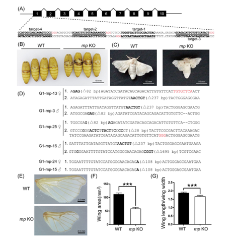 在该研究中,首先通过配制杂交分离群体,利用定位克隆手段确定了一段约260 kb的基因组区域与mp小翅表型紧密相关,其中存在2个基因(KWMTBOMO06923、KWMTBOMO06924)。通过对这两个基因的编码区及非编码区中存在的mp特异突变进行分析,并结合基因的表达部位及在翅原基中的表达差异,最终确定KWMTBOMO06924为mp突变体的负责基因,并将其命名为Bmmp。接着,利用CRISPR/Cas9技术,获得了Bmmp基因敲除的纯合体。与野生型相比,敲除Bmmp纯合体蚕蛾的翅面积显著减小,且翅的长宽比显著变小。在Bmmp敲除蚕的翅原基中,调控前-后轴的基因(engrailed, hedgehog, dpp, gbb)及调控近-远轴的基因(apterous A, apterous B, vestigial, wnt1, distal-less)的表达均显著下调,由此表明,Bmmp基因通过同时调控前-后轴及近-远轴的关键基因的表达,而影响翅形态的发生。调查mp在果蝇中的直系同源基因的功能,发现果蝇的mp直系同源基因突变体的翅面积显著变小,且翅出现卷曲的形态,并导致其飞行能力完全丧失,表明mp基因在家蚕及果蝇中功能具有保守性。