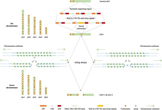 作者开展比较基因组分析,发现与之前版本基因组相比,Mnot-SWU共新组装出83.81 Mb的区间,Mnot-SWU的每条染色体上均存在数个新组装的区间,且这些新组装区间与基因组中串联重复序列分布模式一致,与基因分布模式相反。作者进一步通过对串联重复序列聚类鉴定出桑树的着丝粒序列m3cp,通过分析m3cp的分布模式,并进一步结合Chip-seq以及FISH验证,最终证实桑树是一个多着丝粒染色体的物种。通过对chr5染色体结构特征的分析,提出了桑树染色体断裂融合循环的模型:在chr5染色体的28-33 Mb区间内存在一个新形成的着丝粒,该着丝粒的形成,介导了桑树染色体的断裂融合现象。