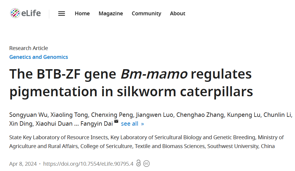 2024 年4月8日,生物学领域国际著名期刊《eLife》在线发表了资源昆虫高效养殖与利用全国重点实验室代方银教授团队的最新科研成果“The BTB-ZF gene Bm-mamo regulates pigmentation in silkworm caterpillars”。该项研究揭示了一个锌指蛋白基因调控家蚕幼虫体色模式的功能及机制。