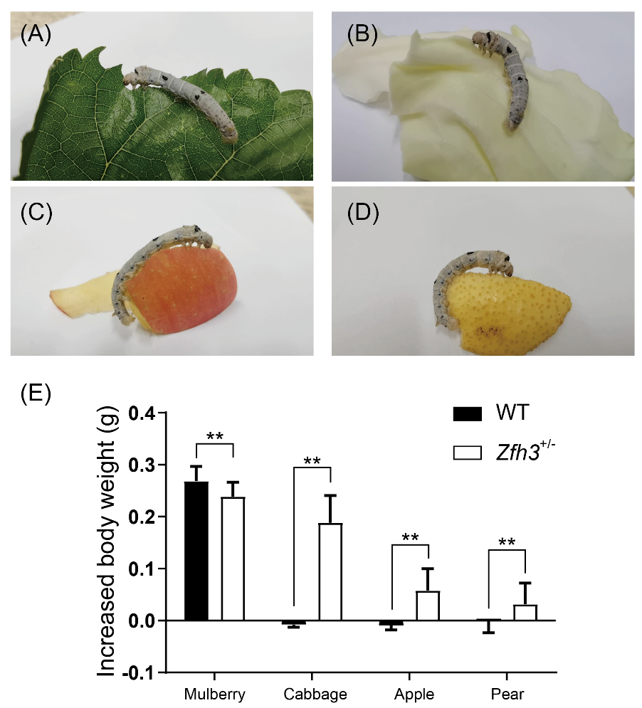 Zfh3敲除杂合体丧失了对桑叶的偏好性,获得了取食多种非桑植物的能力