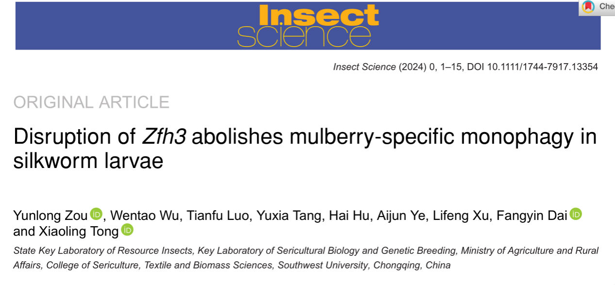 2024年4月15日,资源昆虫高效养殖与利用全国重点实验室童晓玲教授课题组在昆虫科学国际期刊Insect Science(中科院SCI分区1区)在线发表了题为“Disruption of Zfh3 abolishes mulberry-specific monophagy in silkworm larvae”的研究论文,该研究揭示转录因子Zfh3调控家蚕对桑叶的偏好性。