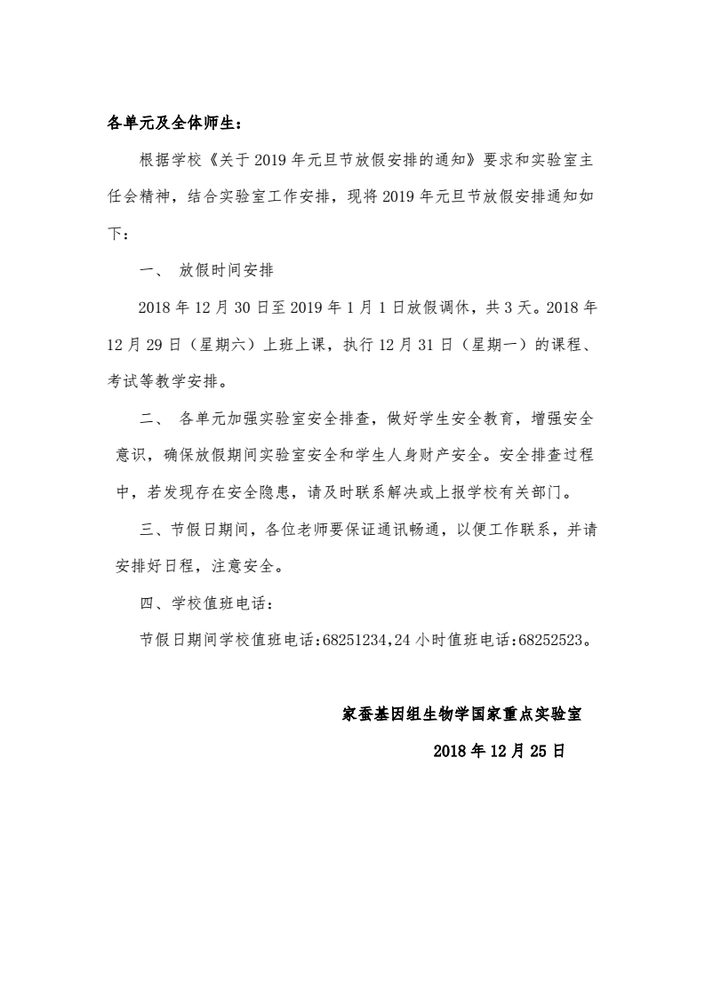 家蚕基因组生物学国家重点实验室关于2019年元旦节放假安排的通知