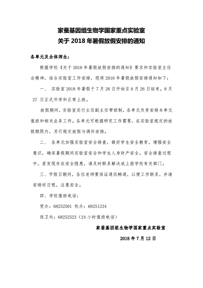 家蚕基因组生物学国家重点实验室 关于2018年暑假放假安排的通知