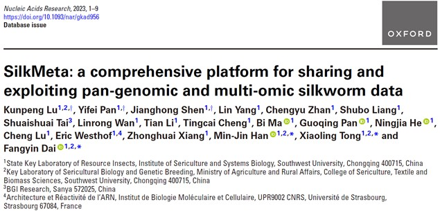 2023年11月6日,生物学领域国际著名期刊Nucleic Acids Research(《核酸研究》)在线发表了PA视讯官网资源昆虫高效养殖与利用全国重点实验室代方银教授团队的最新科研成果——家蚕泛基因组和多组学数据分析平台(SilkMeta)。这是继2022年研究团队发表家蚕泛基因组论文(Nat. Commun., 2022)之后,在家蚕种质资源基因组和生物信息分析领域取得的又一突出进展,标志着团队创建“数字家蚕”的工作迈入新阶段,对于推动家蚕泛基因组成果在功能基因组、基因组选择和分子设计育种等方面的研究应用具有重要意义。