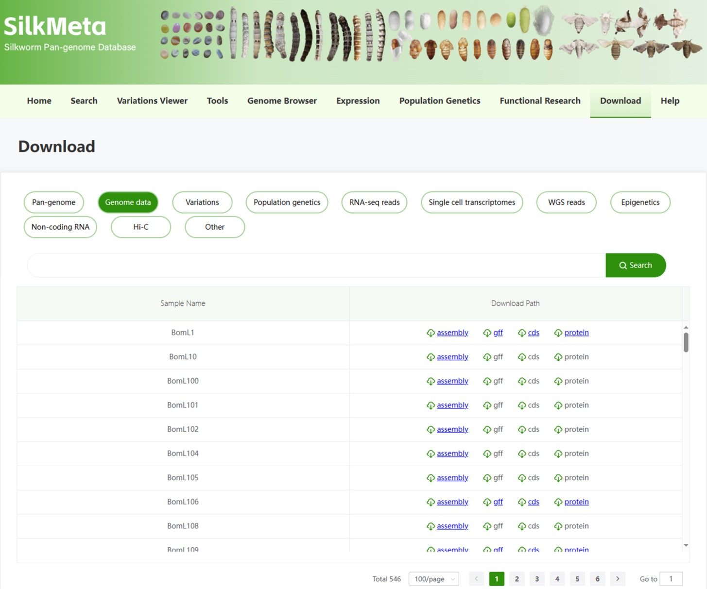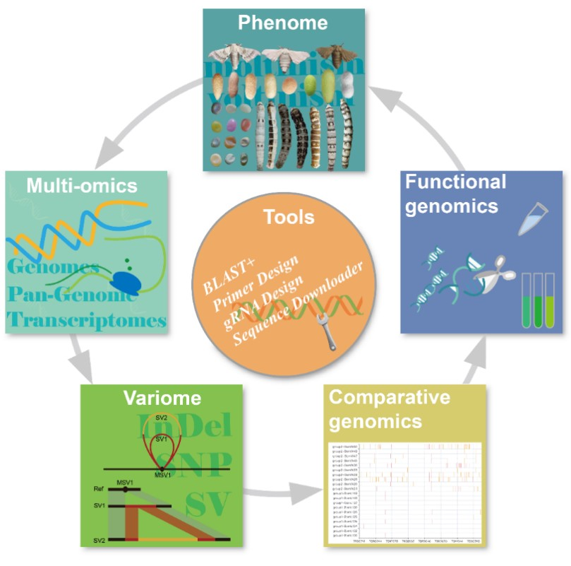 SilkMeta整合了家蚕基因组、转录组、变异组、表型组等多组学数据和功能基因研究数据,并提供了开展比较基因组和功能基因组等方面研究的分析工具。目前数据库涵盖了丰富的数据内容,包括:294种家蚕质量性状基因型特征、546个基因组、1168个转录组、4300多万个单核苷酸变异(SNPs)、930多万个小片段插入/缺失(InDels)、340多万个大片段结构变异(SV)、19411个种内基因簇、7216个种间基因簇以及家蚕的全长转录本、转座子、转录因子、small RNA(circRNA、miRNA、piRNA)、染色质免疫共沉淀测序(ChIP-seq)数据、甲基化测序数据、Hi-C测序数据等,是迄今涵盖数据类型最全、数据量最大的家蚕组学数据库。