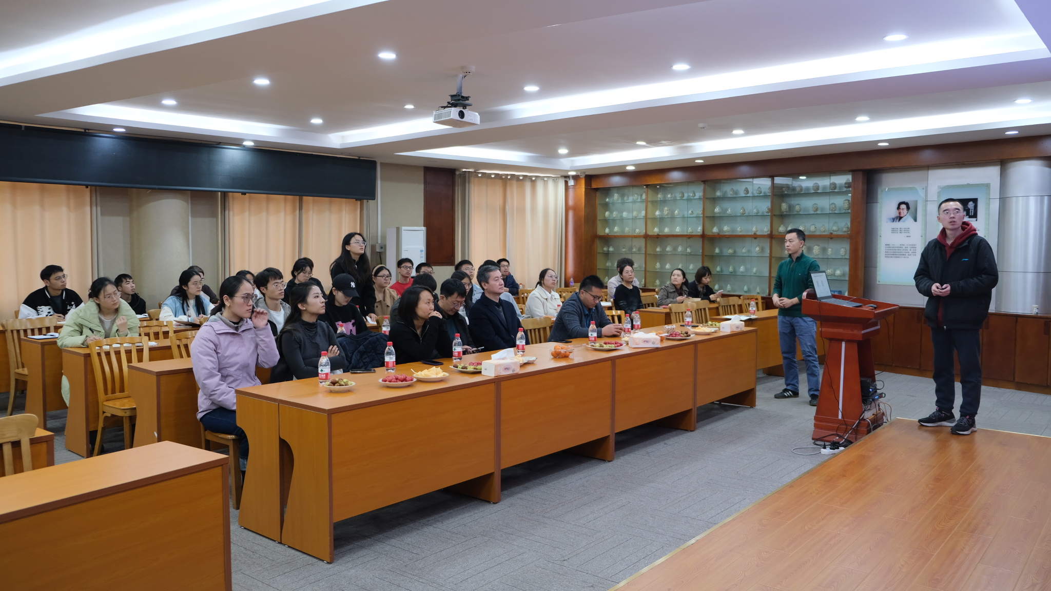在场师生们积极提问并与两位报告人开展互动交流,气氛热烈。学术报告活动后,胡永刚研究员带各位老师参观了实验室并介绍了相关情况,陆昆鹏博士为到访老师们介绍了家蚕超级泛基因组研究工作和数据库平台。到访老师们纷纷表示期望与我室加强交流,建立合作关系。