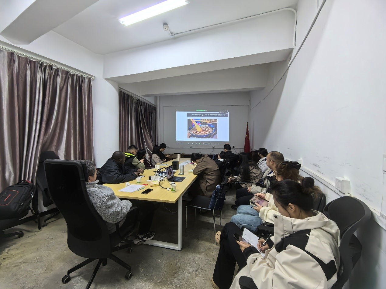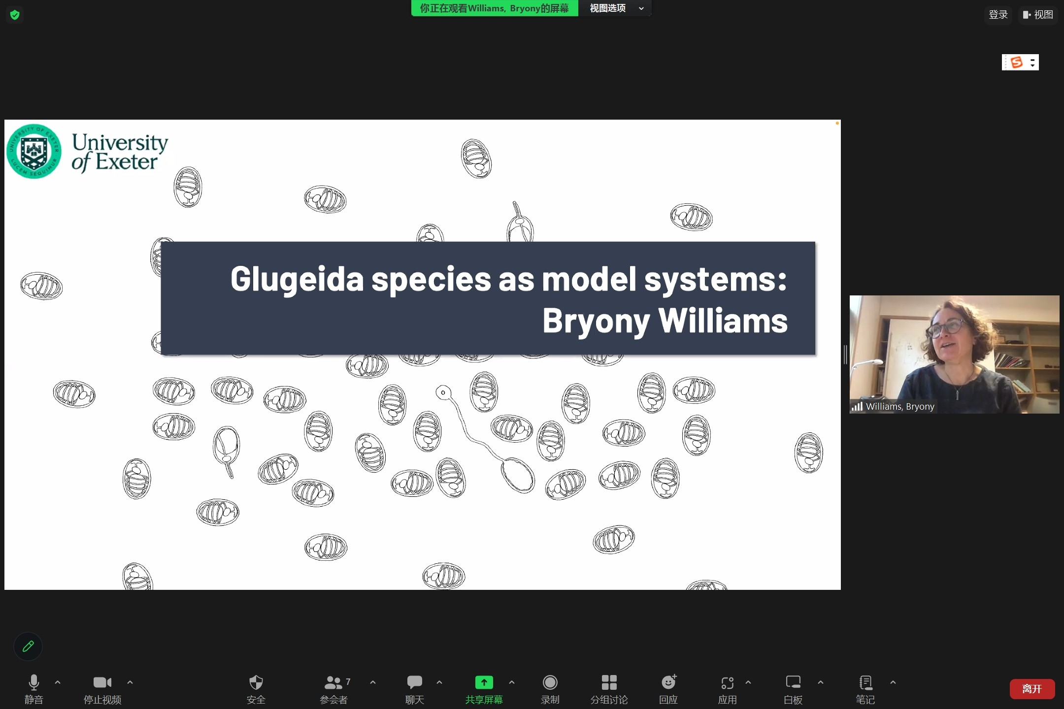 Dr. Bryony Williams以“EHP and its relatives” 为题的报告,介绍了团队在对虾微孢子虫EHP的比较基因组学分析和病原溯源方面的新进展。“Glugeida species as model systems” 为题的报告,介绍了Glugeida属微孢子虫作为开展病原侵染装置结构解析、增殖机制研究及病原与宿主相互作用等方面的优势。此外,Dr. Bryony Williams还介绍了针对欧洲资源昆虫微孢子虫感染情况的调查研究。参会师生围绕微孢子虫比较基因组与功能基因组学、传播途径、侵染结构等方面与Dr. Bryony Williams进行了热烈的讨论。潘国庆研究员指出这是一次非常有意义的友好学术交流,并将与Williams教授及其团队继续保持长期的友好交流。