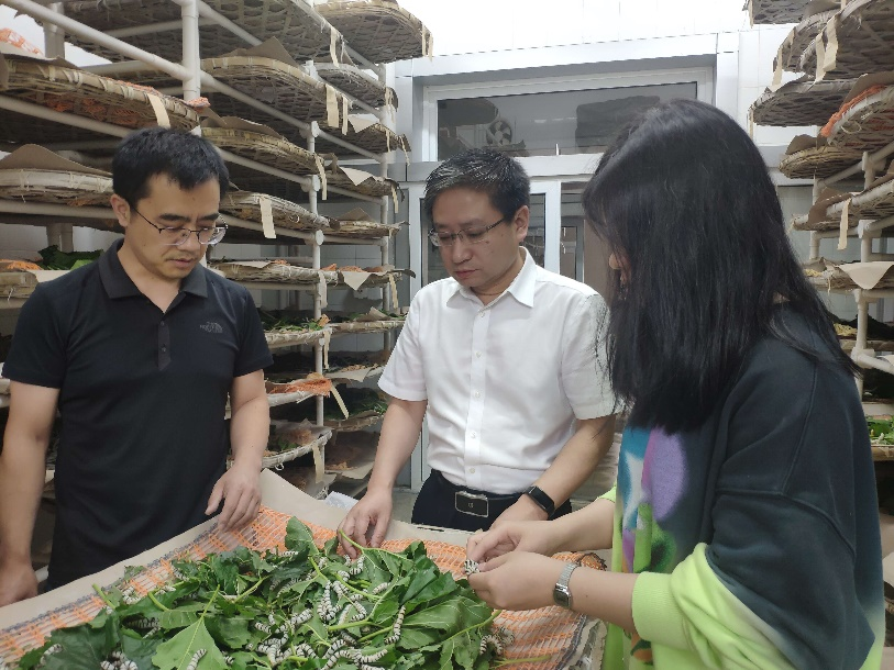 代方银(中)在蚕桑基地调研。 (受访者项目组供图)