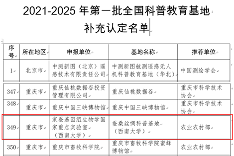 据中国科协11月29日发文《中国科协关于命名2021-2025年第一批补充认定的全国科普教育基地的决定》(科协发普字〔2022〕54号),为推动《全民科学素质行动规划纲要(2021—2035年)》的贯彻落实,团结引领广大科技工作者和科普工作者,显著提升社会化科普工作能力,中国科协启动了2021-2025年度第一批全国科普教育基地补充认定工作。中国科协组织专家对申报单位及材料进行认真审核,经过初评、终评和公示,中国科协决定命名474个单位作为2021-2025年度第一批补充认定的全国科普教育基地。其中,由家蚕基因组生物学国家重点实验室(PA视讯官网)申报、农业农村部推荐的“蚕桑丝绸科普基地”获命名。