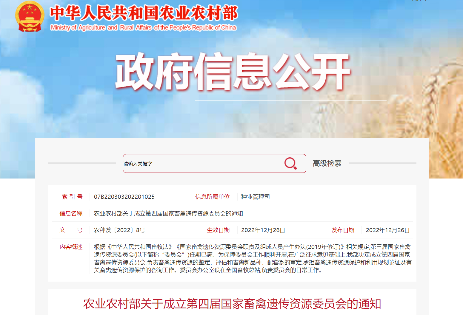 近日获悉,农业农村部于2022年12月26日发布了《农业农村部关于成立第四届国家畜禽遗传资源委员会的通知》(农种发〔2022〕8号),公布了新成立的第四届国家畜禽遗传资源委员会及专业委员会组成(人员名单于2023年1月3日印发)。