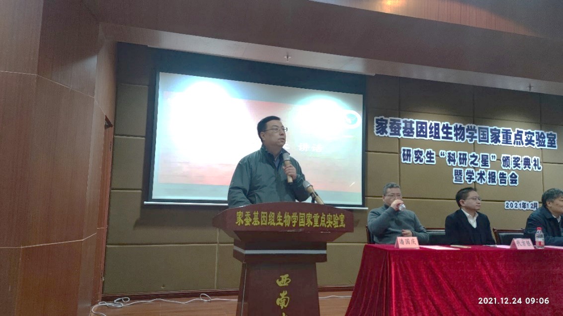 12月24日上午,家蚕基因组生物学国家重点实验室2020年度研究生“科研之星”颁奖典礼暨学术报告会在蚕学宫学术报告厅举行。学校副校长王进军,国重室学术委员会副主任周泽扬,蚕桑纺织与生物质科学学院党委书记张袁松等院领导,国重室主任、学院院长代方银,副主任何宁佳、崔红娟、潘国庆等实验室领导及指导教师和研究生代表200余人参加典礼。31名研究生受到表彰,分获特、一、二、三等奖,分享33.25万元奖金,其中特等奖奖金为5万元。