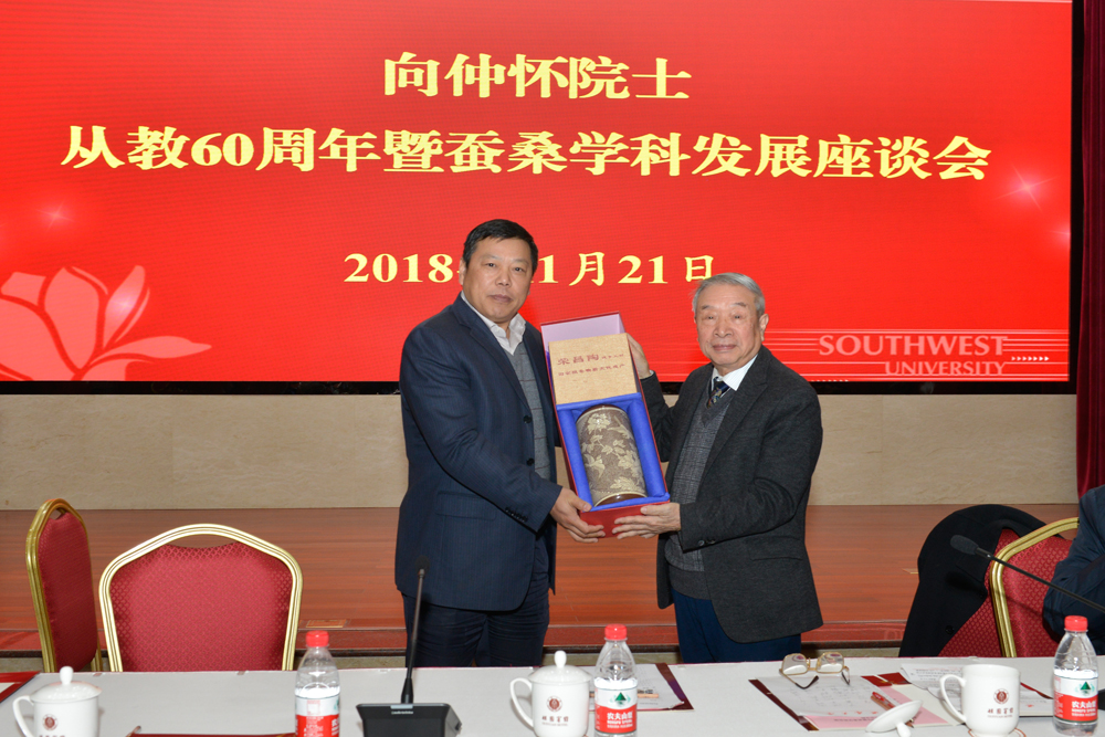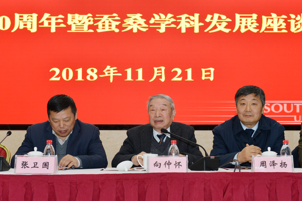 11月21日下午,学校在东方红会议厅举行“向仲怀院士从教60周年曁蚕桑学科发展座谈会”,中国工程院院士向仲怀,校长、党委副书记张卫国,副校长崔延强、靳玉乐、王进军,原副校长丁忠民,校学术委员会主任、原副校长周常勇,重庆师范大学校长周泽扬,西北农林科技大学副校长钱永华,教育部人文社科重点研究基地-西南民族教育与心理研究中心原主任张诗亚,苏州大学原动物科学院院长沈卫德,国家蚕桑产业技术体系首席科学家、中国蚕学会名誉理事长鲁成,党办、校办、组织部、宣传部、教师工作部、人事处、研究生院、教务处、科技处、社科处等职能部门以及家蚕基因组生物学国家重点实验室、生物技术学院、动物科技学院、园艺园林学院、纺织服装学院等相关单位负责人、师生代表共计80余人欢聚一堂,分享向先生的人生故事和成果,畅谈蚕桑学科发展大计。座谈会由崔延强副校长主持。