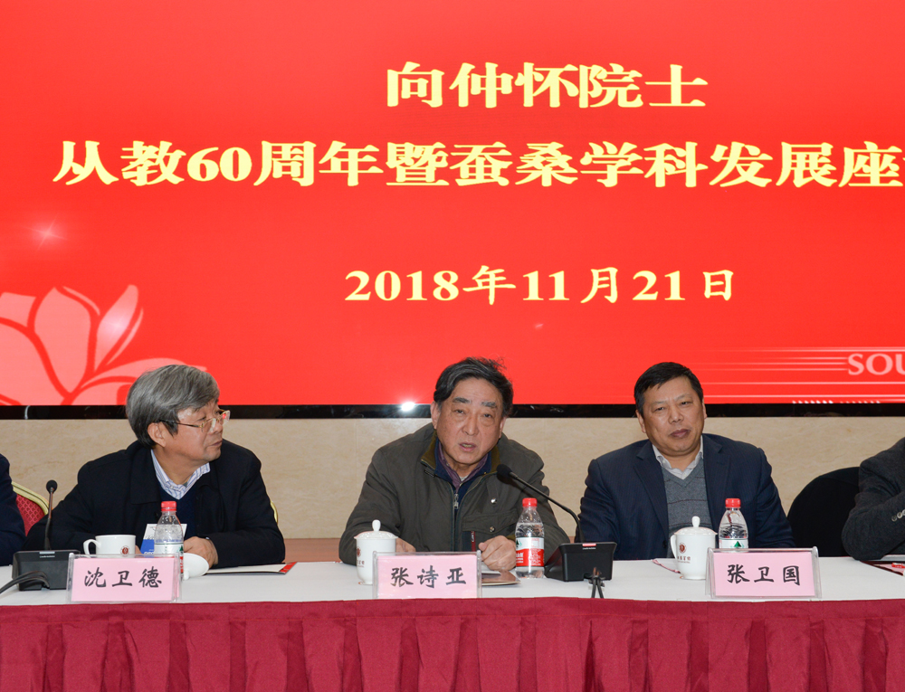 张诗亚教授发言讲到,他与向院士合作培养了一些搞蚕桑文化的学生,跟向先生共过事,有交情。怎样保持蚕桑学科的地位?张教授说:“现在不应再是大学或者专业来顺应市场社会发展的需求,而是由大学开创新的人类从来没有的专业学科,这个关系是彻底跟以前不同的改变。因此,蚕桑学科今后怎么样?结合刚才钱校长讲的包括人工智能等新的东西,从而开辟一个崭新的综合领域,这才是学科发展的根本。这不仅仅是蚕桑,某种意义上对整个大学的学科都提出了挑战,倘若我们走到前头,真正在新的形势下高瞻远瞩,创造新的学科,培养新的生产力,这才是大学的责任”。张诗亚先生触境生情,现场赋诗一首祝贺向院士教坛60年风雨过后的成就和喜悦:“六十年光有几多,回眸来时可蹉跎;从来只问耕耘事,莞尔收秋四野歌”。
