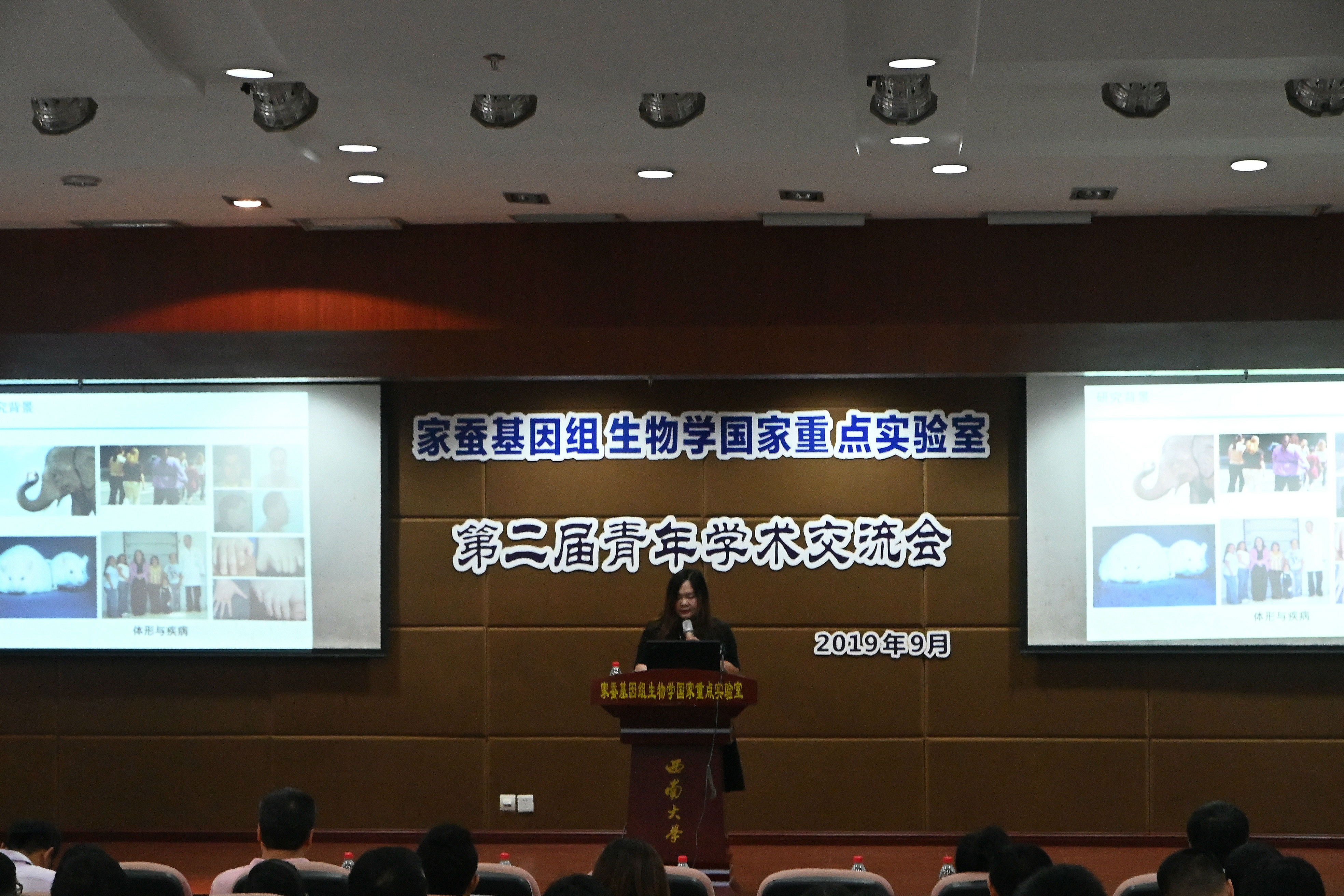 2019年9月5日,在举国喜迎中华人民共和国建立70周年之际,家蚕基因组生物学国家重点实验室“第二届青年学术交流会”在蚕学宫报告厅胜利召开。实验室学术委员会副主任周泽扬教授、PA视讯官网研究生院赵国华院长、校科技处李雪梅副处长,实验室外国专家三田和英教授、生物技术学院党委吴俊平书记、副院长徐汉福教授和谢洁教授,实验室副主任何宁佳教授、崔红娟教授、程道军研究员、潘国庆研究员,以及实验室师生共计200余人参加了会议。实验室副主任潘国庆教授主持了本次会议开幕式。