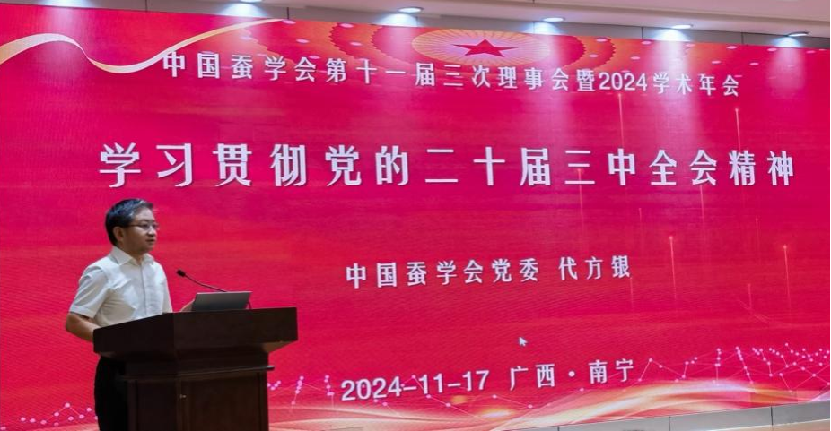 在开幕式之后的十一届三次理事会上,学会党委书记代方银根据中国科协开展“百名科学家讲党课”活动精神,以《学习贯彻党的二十届三中全会精神》为题讲授了党课,要求学会理事会和各机构要以钉钉子精神扎实抓好各项改革任务的落实。刘利秘书长报告学会2024年的主要工作和成效。理事会还表决通过了关于成立中国蚕学会团体标准工作委员会的议案、调整理事会部分成员的议案。