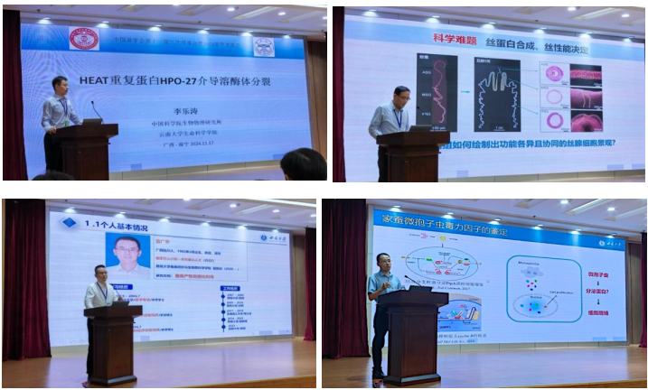 实验室多位教师分别做了特邀报告、大会报告和交流报告。其中,引进中的中国科学院生物物理研究所与云南大学联合培养的优秀青年李乐涛博士作题为《HEAT重复蛋白HPO-27介导溶酶体分裂》的特邀报告;徐汉福教授、蓝广芊教授、李田研究员分别作题为《家蚕丝腺时空图谱计划》《基于仿生学原理创制高性能丝素生物材料》和《微孢子虫通过表观遗传重编程抑制家蚕生长》的大会报告;龙梦娴副教授、梁九波副教授、侯建兵副教授、李冠楠讲师、张少宇博士后等分别作交流报告。