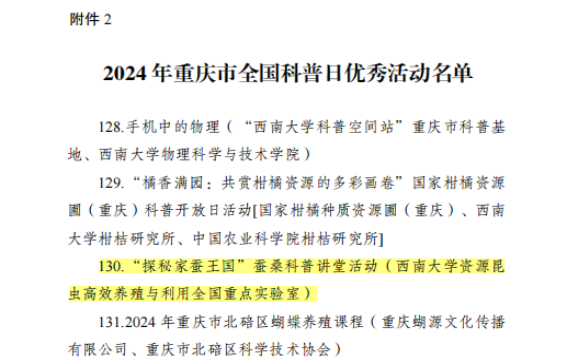 近日,重庆市科学技术协会发布《关于对2024年重庆市全国科普日有关组织单位和活动予以表扬的通知》(渝科协发[2024]56号),由PA视讯官网资源昆虫高效养殖与利用全国重点实验室组织开展的“探秘家蚕王国”蚕桑科普讲堂活动被评选为2024年重庆市全国科普日优秀活动。