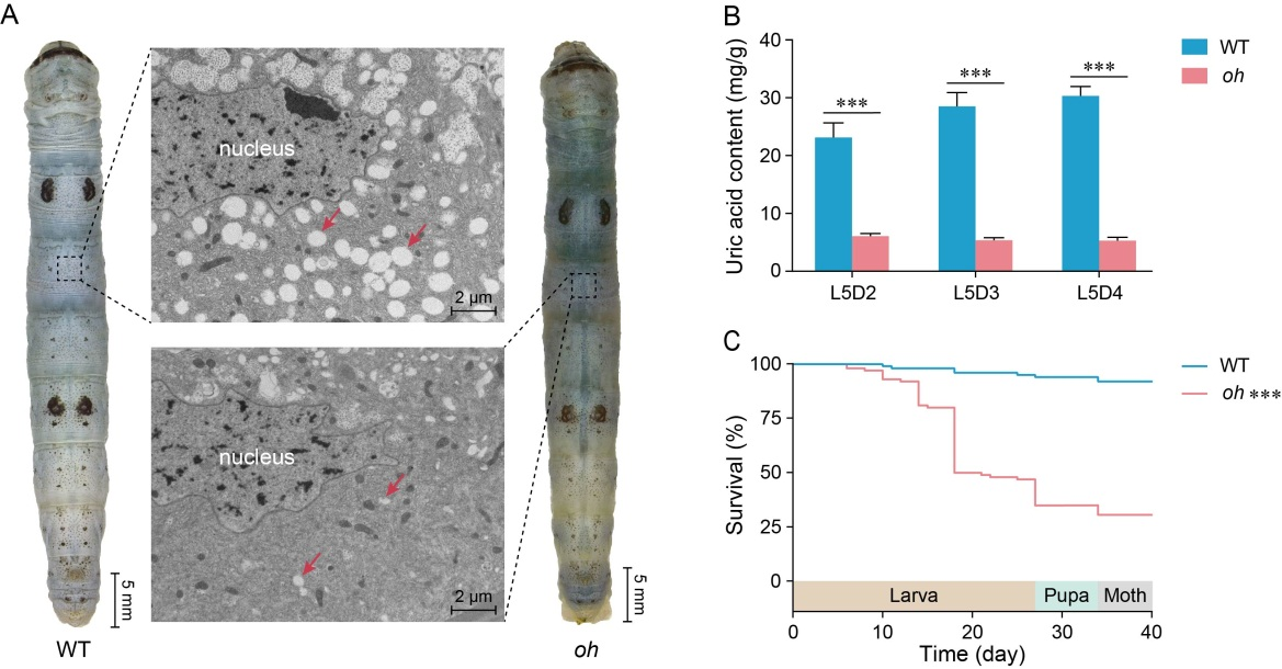 家蚕是鳞翅目模式昆虫,幼虫期表皮蓄积的大量尿酸颗粒使其呈白色而不透明;相反,表皮中尿酸颗粒减少会导致其呈不同程度的透明状(称为油蚕)。这表明尿酸是家蚕体色模式的重要物质基础之一。此外,这些尿酸颗粒也增强了家蚕幼虫的抗紫外线能力,提示参与这一过程的基因也可能成为鳞翅目害虫防治的候选靶标。