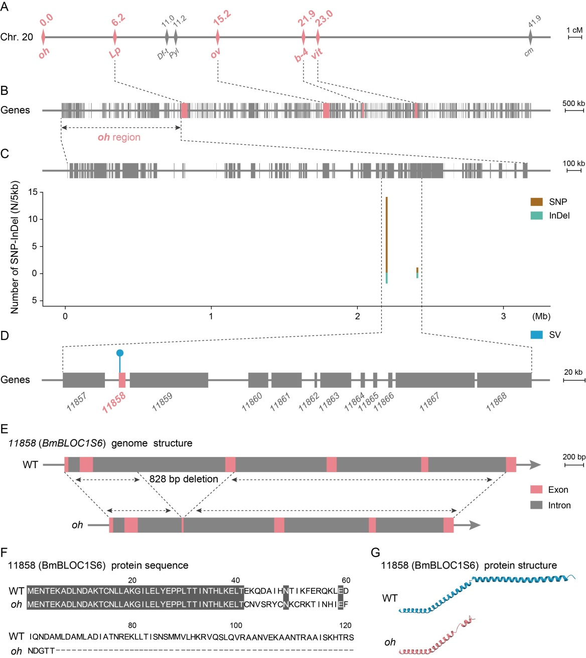 本研究基于家蚕高质量泛基因组数据和经典遗传连锁图谱,确定了BmBLOC1S6(Biogenesis of Lysosomal-related Organelles Complex 1 Subunit 6)是霜降油蚕的候选基因(图1A-E),并发现霜降油蚕BmBLOC1S6基因中828 bp大片段缺失会导致其蛋白质编码提前终止(图1F-G)。