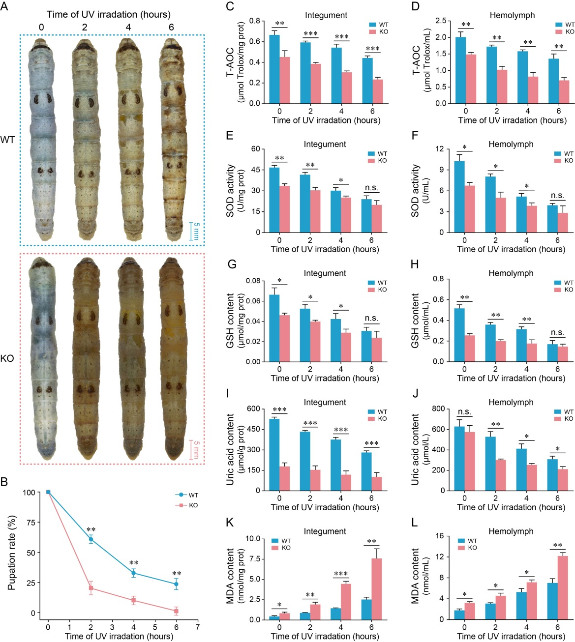 图5. 紫外线照射对家蚕野生型(WT)和BmBLOC1S6-KO幼虫的影响