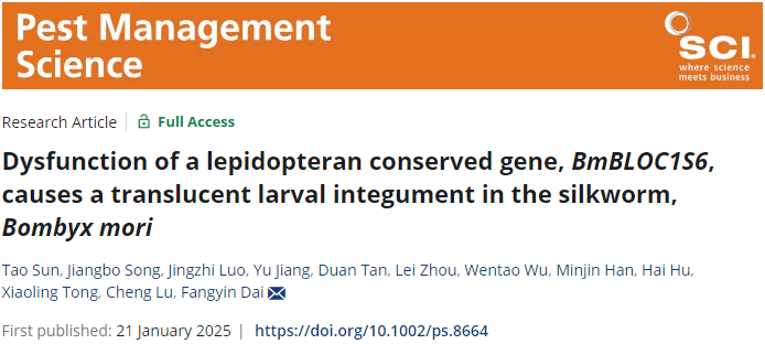 2025年1月21日,中科院分区一区学术期刊Pest Management Science在线发表了PA视讯官网资源昆虫高效养殖与利用全国重点实验室代方银教授团队题为“Dysfunction of a lepidopteran conserved gene, BmBLOC1S6, causes a translucent larval integument in the silkworm, Bombyx mori”(鳞翅目保守基因BmBLOC1S6的功能障碍导致家蚕幼虫表皮呈半透明)的研究论文。该项研究揭示了家蚕霜降油蚕(hoarfrost translucent, oh)突变体的负责基因为BmBLOC1S6,并阐明其在家蚕(鳞翅目昆虫)表皮尿酸颗粒形成中的关键作用。研究结果不仅在家蚕突变体解析方面具有重要指导意义,也对鳞翅目害虫的生态防控具有一定参考价值。
