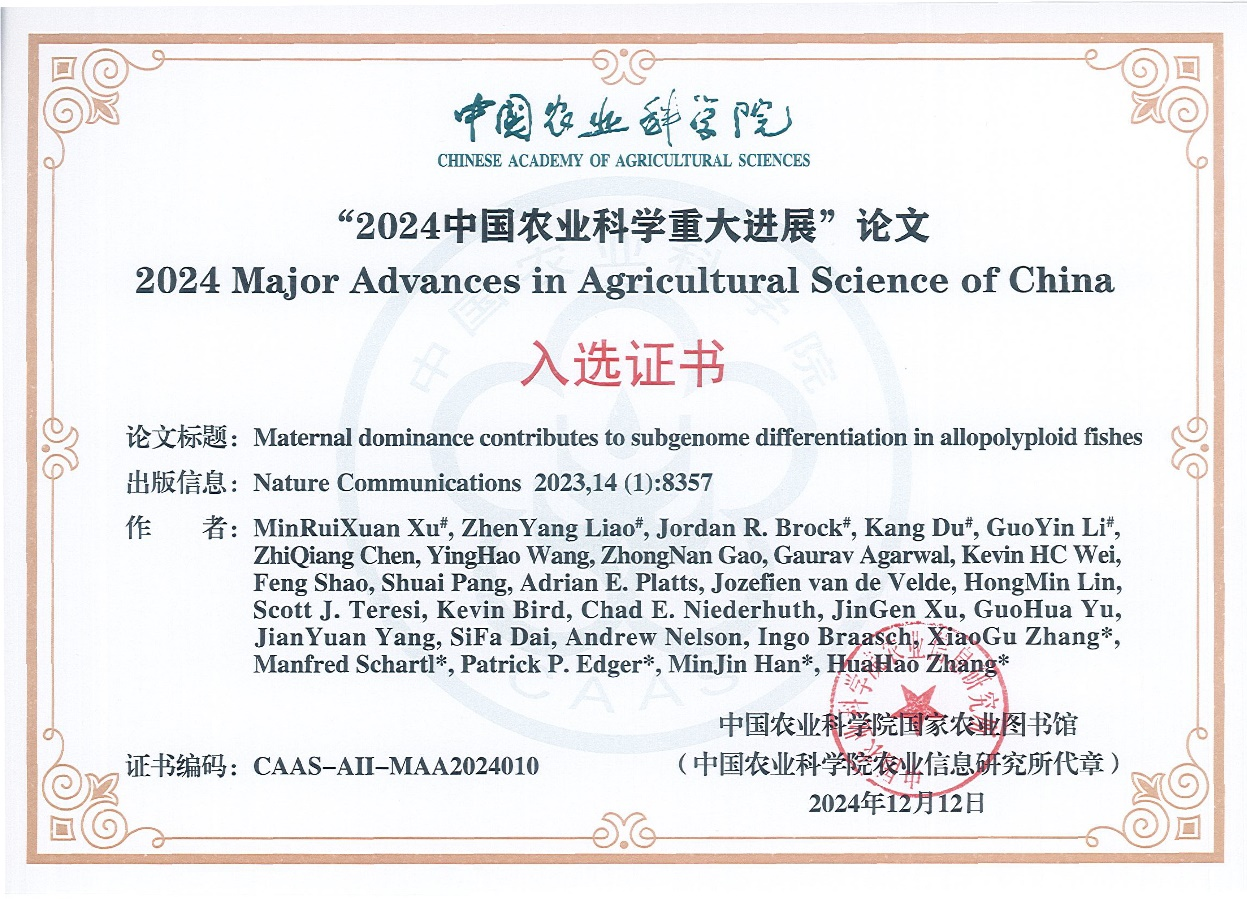 2024年12月12日,在2024中国农业农村科技发展论坛暨全球农业研究热点前沿与科技竞争力成果发布会上,中国农业科学院发布《2024中国农业科学重大进展》,十项成果入选。其中,我室毕业校友、九江学院药学与生命科学学院张化浩教授领衔完成的研究成果“Maternal dominance contributes to subgenome differentiation in allopolyploid fishes”(母系优势有助于异源多倍体鱼类亚基因分化)入选。本实验室为该成果合作完成单位,实验室韩民锦副教授为该论文共同通讯作者。该研究揭示了多倍体鱼类亚基因组不对称进化的普遍规律。