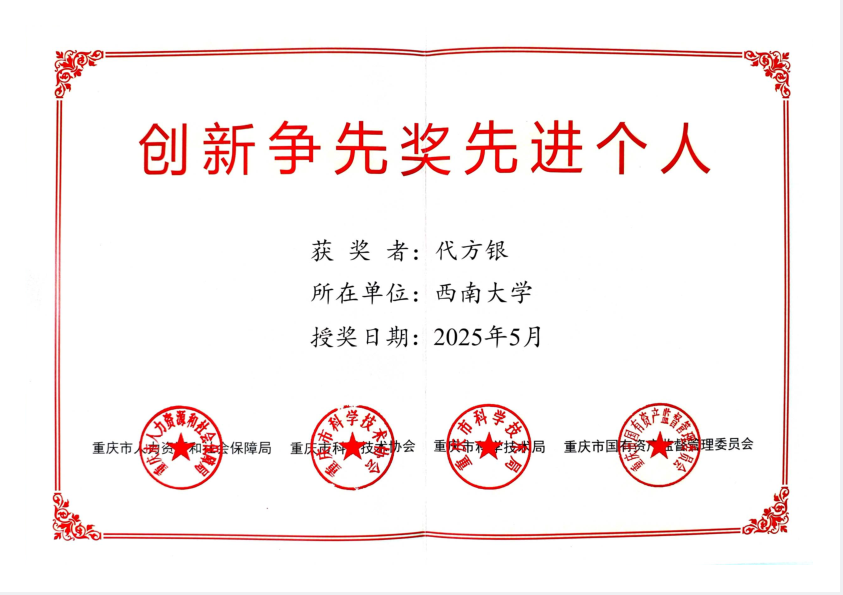 在第九个“全国科技工作者日”前一天,2025年5月29日,重庆市人社局、市科协、市科技局、市国资委在市科技馆联合召开2025年重庆市全国科技工作者日主场活动暨创新争先奖表彰大会。本实验室主任、国家蚕桑产业技术体系首席科学家代方银教授荣获“创新争先奖先进个人”。