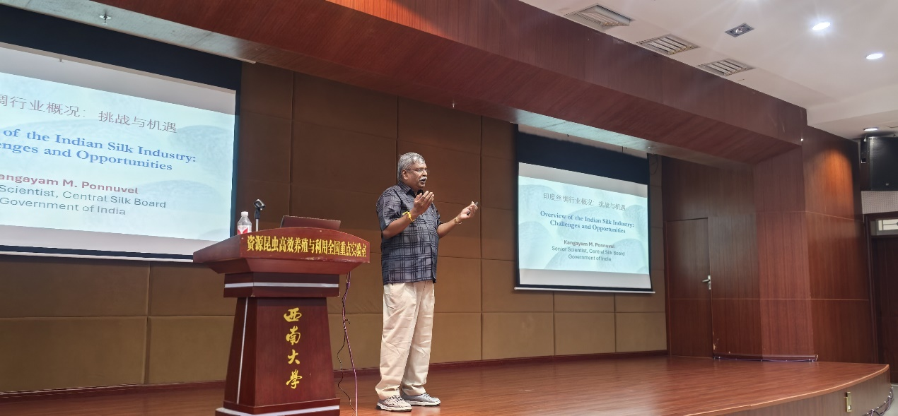 2025年10月10日上午,Ponnuvel研究员在蚕学宫学术报告厅作了题为 “Overview of the Indian Silk Industry: Challenges and Opportunities” 的学术报告,实验室师生共百余人参加了报告会。报告中,Ponnuvel研究员详细介绍了印度蚕桑丝绸产业的发展现状,从印度主要蚕种及区域分布等方面深入分析了印度蚕业在遗传育种、病害防控、市场拓展与可持续发展方面面临的主要挑战;Ponnuvel研究员指出,气候变化、养殖技术差异及病害依然是制约印度蚕业发展的关键因素,同时数字化育种与国际科研合作为行业带来了新的机遇;Ponnuvel研究员还重点介绍了印度在家蚕病害防控、品种遗传改良及丝绸产品多样化利用方面的最新研究进展,展望了未来印度与中国在蚕业科技创新及技术转化领域的合作潜力。
