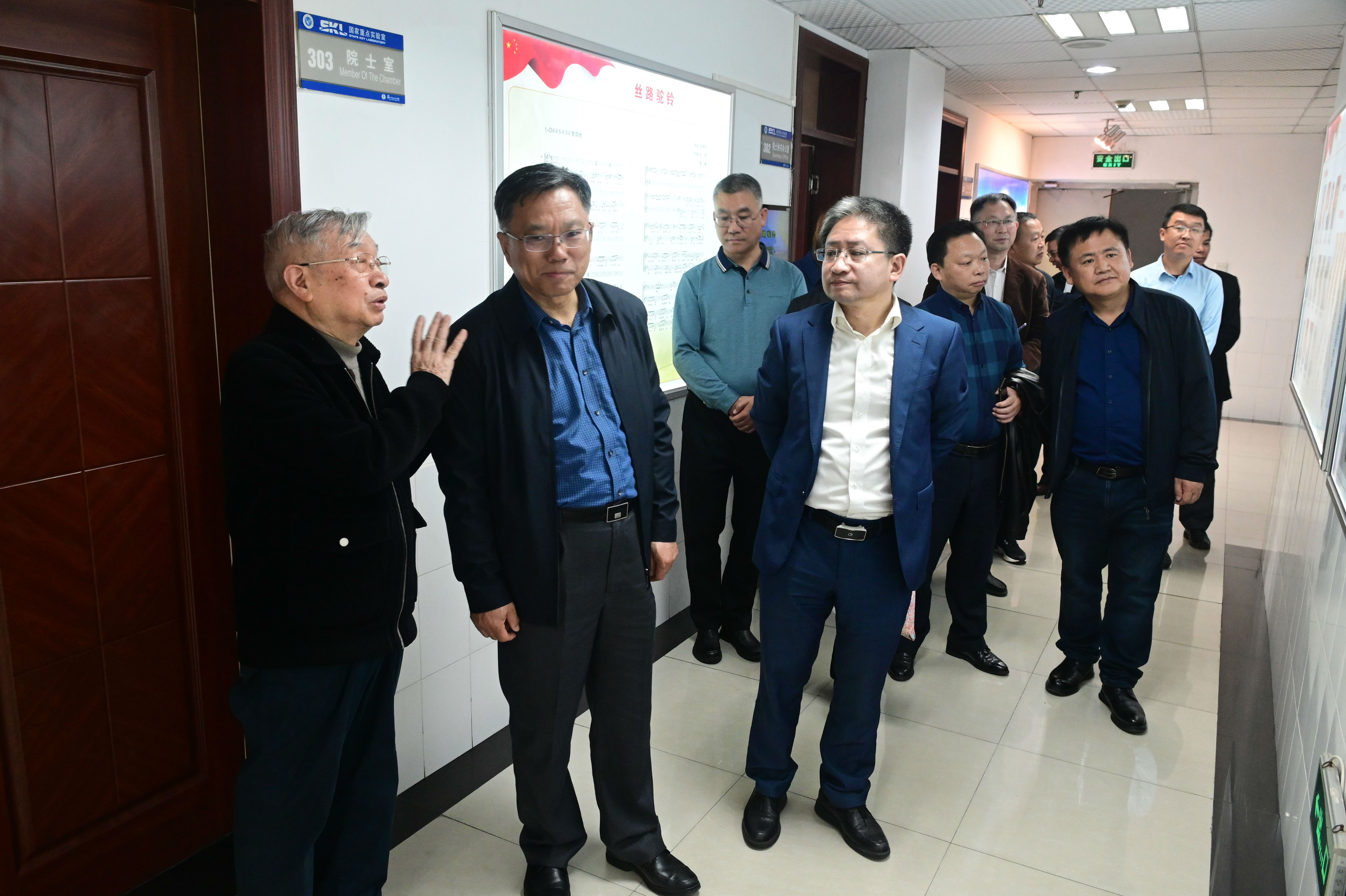最后,时书记一行来到资源昆虫全国重点实验室(原家蚕国家重点实验室)主楼蚕学宫,向仲怀院士率研究骨干与时书记一行亲切面会。在展廊里,向院士亲自向时书记介绍全国重点实验室的沿革和目前有关情况。